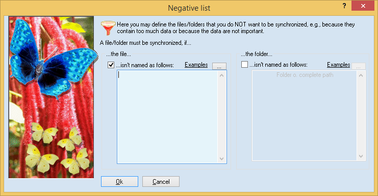 Important: You may exclude files / directories in two ways. On the one hand, you can simply enter the name into a line, e.g., ’Backup’. All directories with this name (no matter where they are) will not be synchronized. On the other hand, you can also enter directory names relative to the task directory. For example, if you want to synchronize the directories ’c:\data\’ and ’\\Server\sub\data’ and you don’t want the directory ’c:\data\test\backup’ to be synchronized, you must enter the line ’\test\backup’. It is important that you start with a backslash (’\’) and then continue with the directory below the task directories.