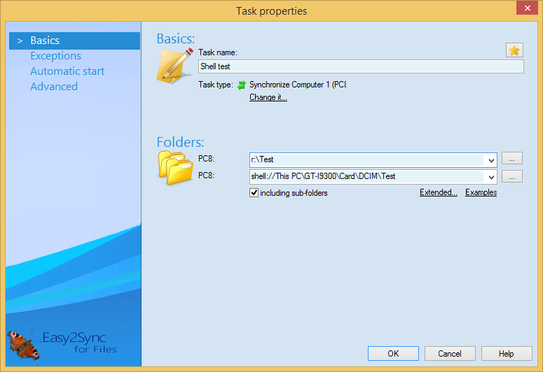 Below the name, you will see the type of the task. Normally you will simply synchronize 2 folders. This is configured as default. But you may also choose a different type, for example to push changes onto a backup computer.