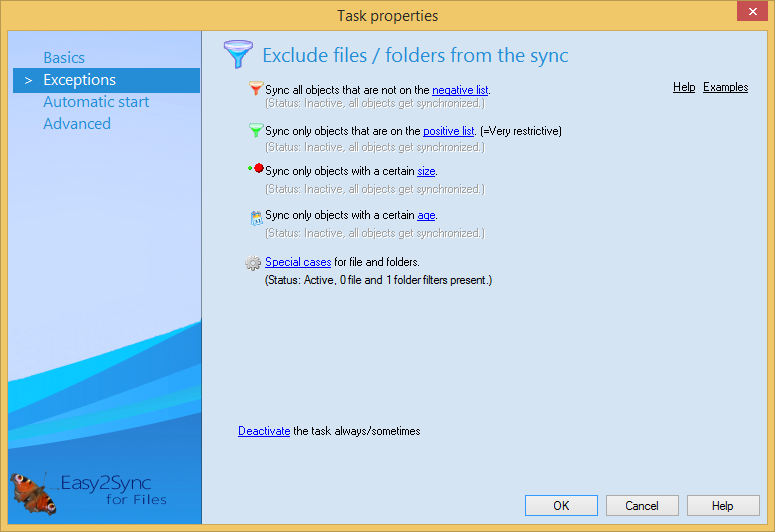 This page allows you to exclude files / folders from the sync. Easy2Sync will completely ignore excluded files.