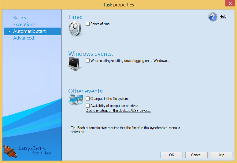 This dialog allows you to configure whether you want Easy2Sync to automatically start the synchronization process at certain times or events. For this, activate the respective option and enter the details in the sub dialog.