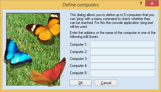 Use this dialog to define up to five computers, which you may test with the ping command later on. You may enter IP addresses, like 192.100.0.1 or computer names, like mycomputer.