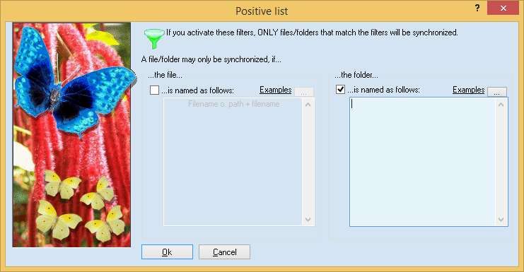 Important: You may include files / directories in two ways. On the one hand, you can simply enter the name into a line, e.g., ’Backup’. All directories with this name (no matter where they are) will be synchronized (if their parent directories are on the positive list, too). On the other hand, you can also enter directory names relative to the task directory. For example, if you want to synchronize the directories ’c:\data\’ and ’\\Server\sub\data’ and you want the directory ’c:\data\test\backup’ to be synchronized, you must enter the line ’\test\backup’. It is important that you start with a backslash (’\’) and then continue with the directory below the task directories.