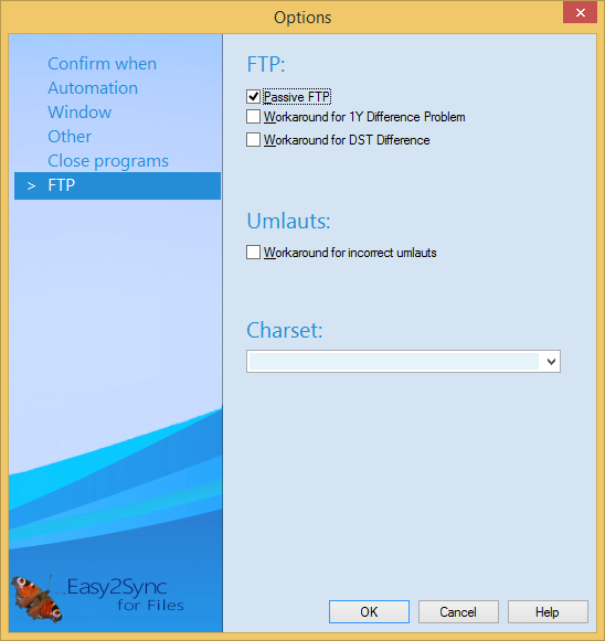 Workaround for 1Y-Difference-Problem: When connecting a Unix-FTP-Server it can happen that the file times are displayed exactly one year wrong. (This problem was officially confirmed by Microsoft and is not caused by Easy2Sync: Q284455 http://support.microsoft.com/default.aspx?scid=kb;en-us;Q284455&gssnb=1) This can of course lead to problems in the synchronization. You can avoid this problem by activating this option. Easy2Sync will then add exactly one year to each file on a ftp server. If you want to configure this on a per-task basis, change the options within the task (last page of the task properties).